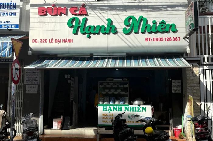Bún cá Hạnh Nhiên là quán bún chả cá Nha Trang ngon toạ lạc ở đường Lê Đại Hành rất dễ tì. Không gian quán bún cá Nha Trang rộng rãi, thoáng mát để thực khách thoải mái ngồi lại thưởng thức.