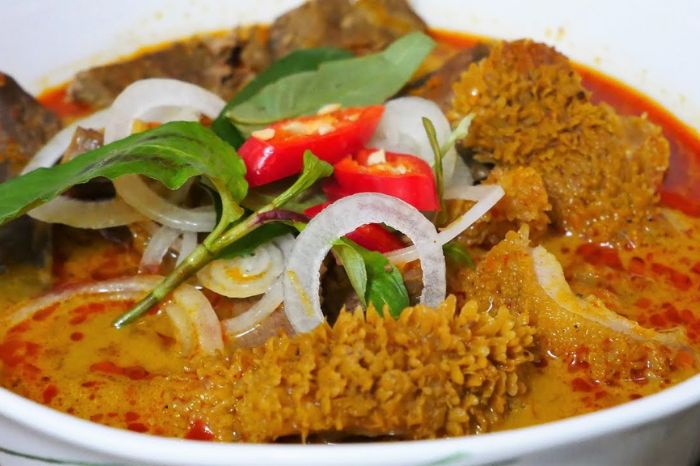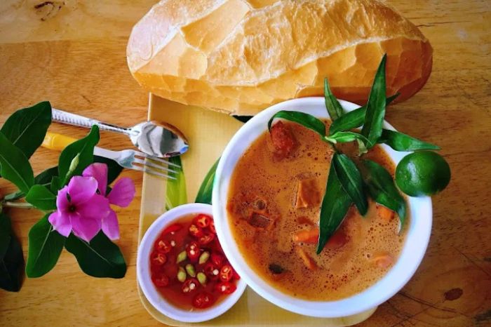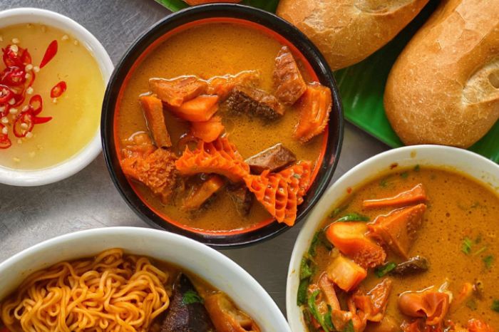 Khi ăn, bạn sẽ cảm nhận được vị thơm ngon của hầm nội tạng, nước dừa tươi, vị béo của cốt dừa và vị cay thơm của ngũ vị hương lẫn quế. Ngoài ra, vị hấp dẫn của nước chấm chua ngọt cùng vị bùi bùi, dai giòn của phần cái sẽ khiến thực khách không thể nào quên.