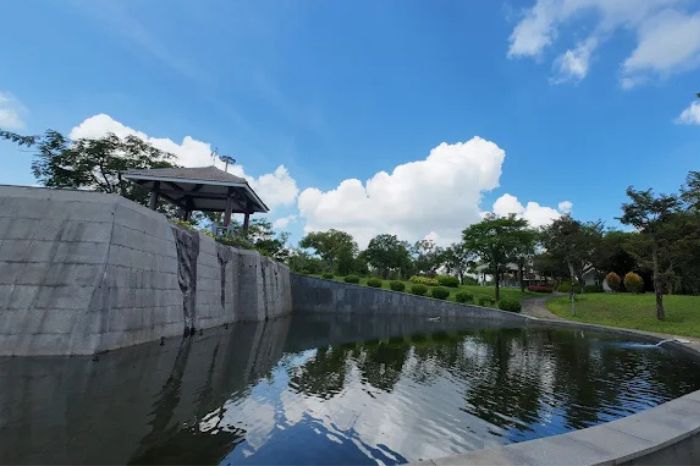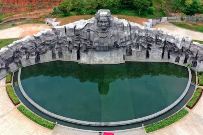 Hình ảnh của tượng đài mẹ Thứ còn gắn liền với hồ nước rộng lớn bao quanh. Hồ có diện tích lên tới hơn 1.000m2 chảy róc rách từ bức tượng đá tràn viền rất đẹp.