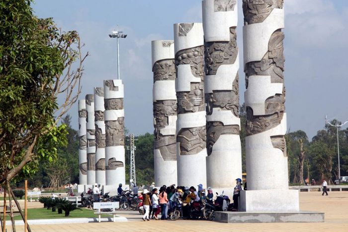 Bài đánh giá về tượng đài mẹ Thứ cũng không thể bỏ qua khu vực ngay trước mặt tượng đài. Nơi đây có 8 cột trụ khổng lồ, sừng sững.